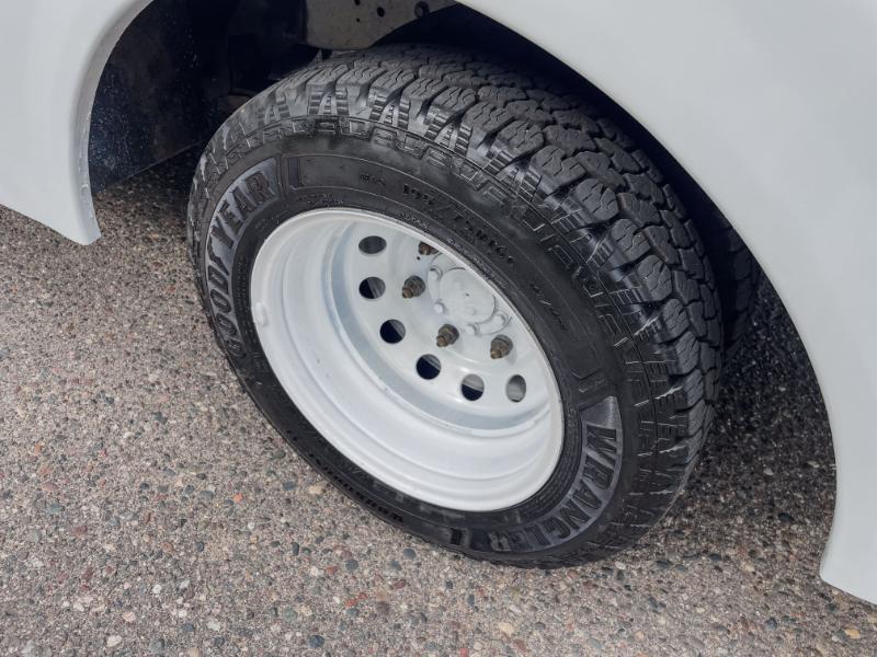 The clean white exterior projects a professional image, while the gray leather interior offers comfort during long workdays. This truck is designed for under-body equipment mounting and features a spacious utility body with multiple secure storage compartments — perfect for tools, parts, and supplies.